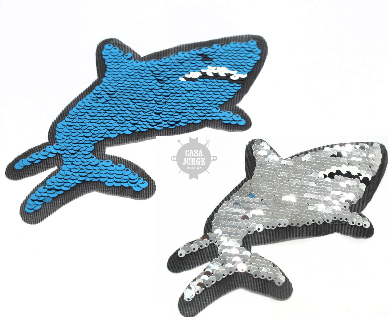 APLIQUES TERMOADHESIVO TIBURON DE LENTEJUELA REVERSIBLE ART 2676 DE 100 POR 150 MM POR UNIDAD MINIMO 50 UNIDADES