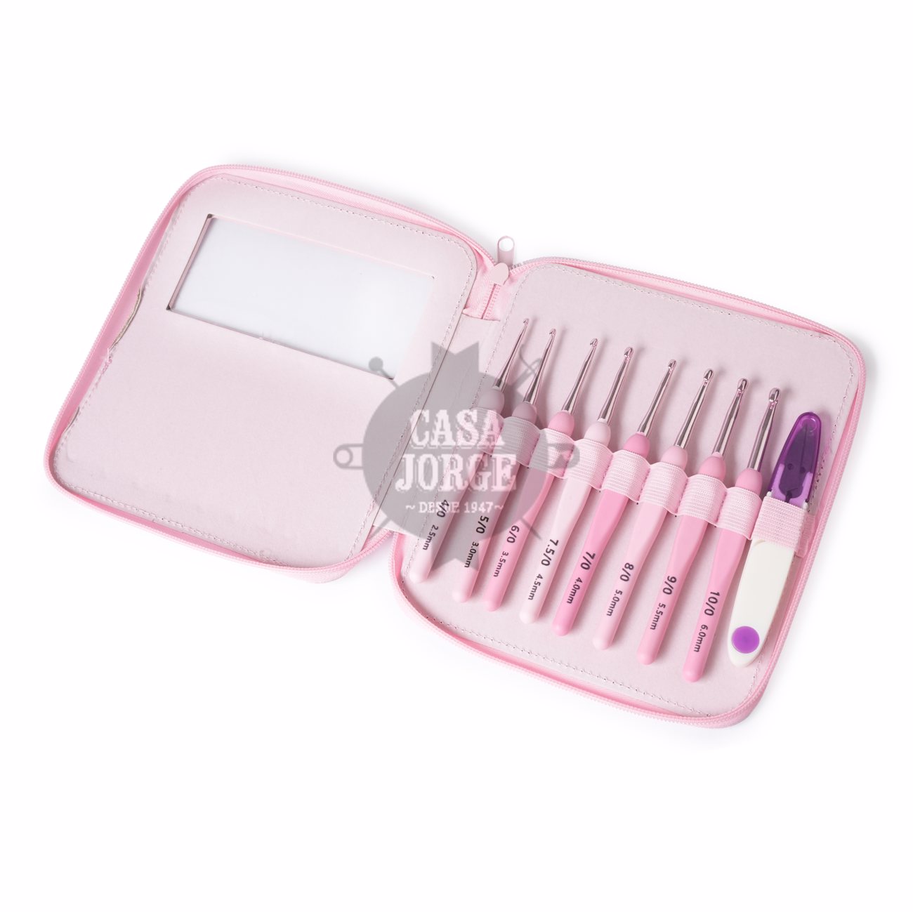 SET 8 AGUJAS CROCHET MANGO ACRILICO + CORTA HILACHA CARTUCHERA ROSA