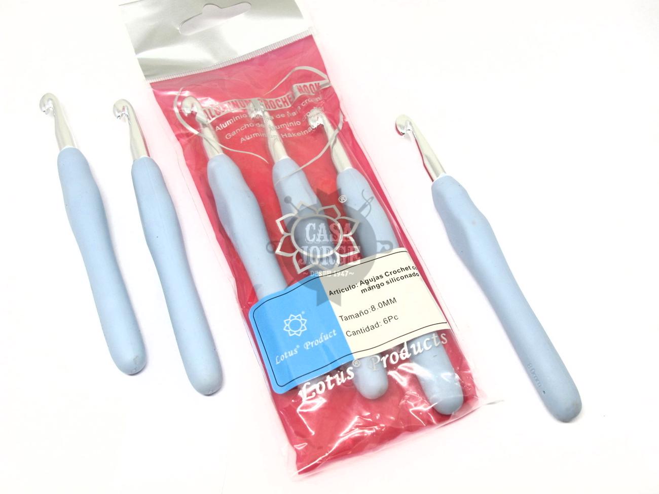 AGUJAS CROCHET DE ALUMINIO CON MANGO SILICONADO LOTUS NUMERO 8 POR 6 UNIDADES