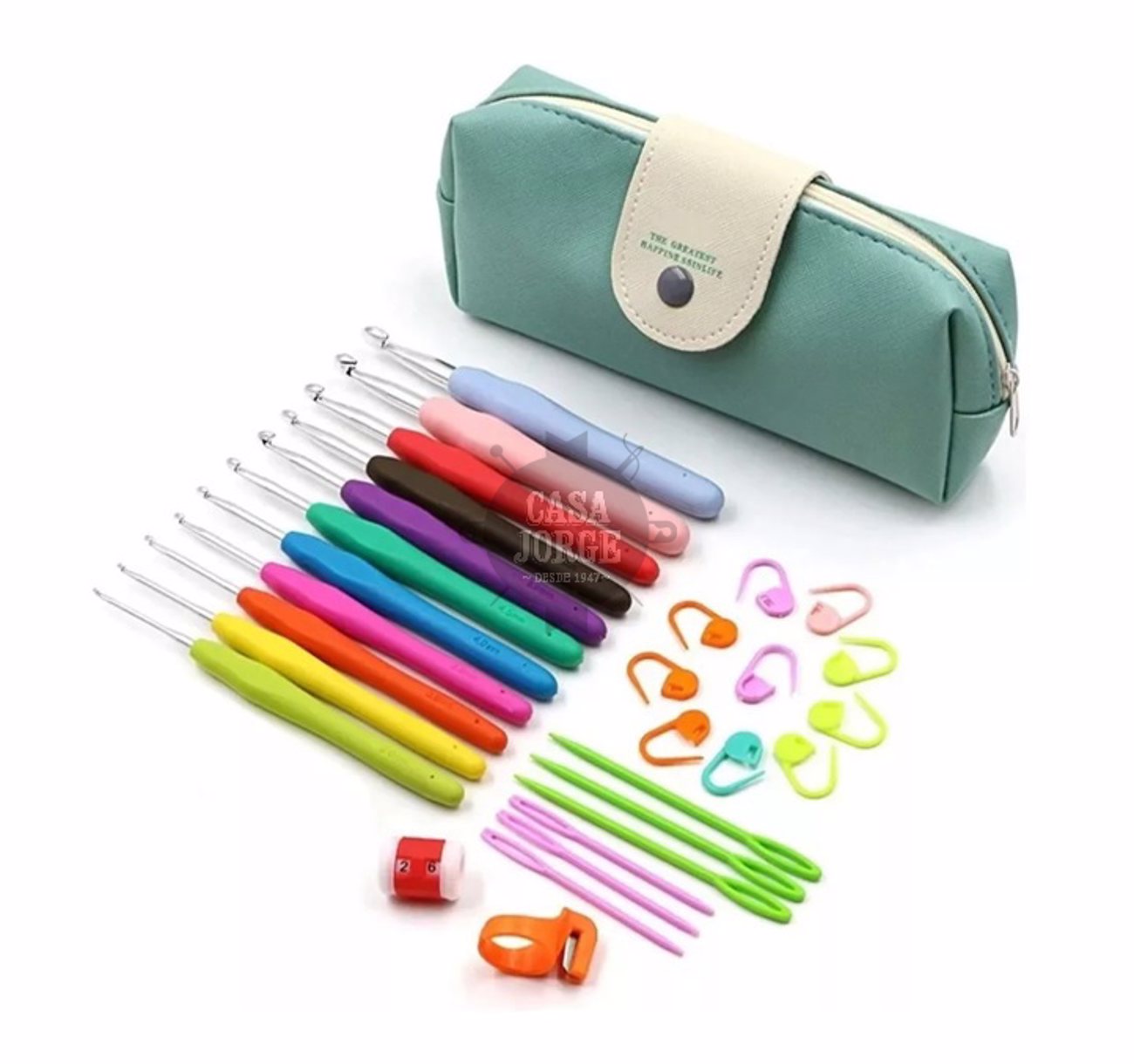 SET DE AGUJAS CROCHET + ACCESORIOS CARTUCHERA CELESTE 30 PIEZAS